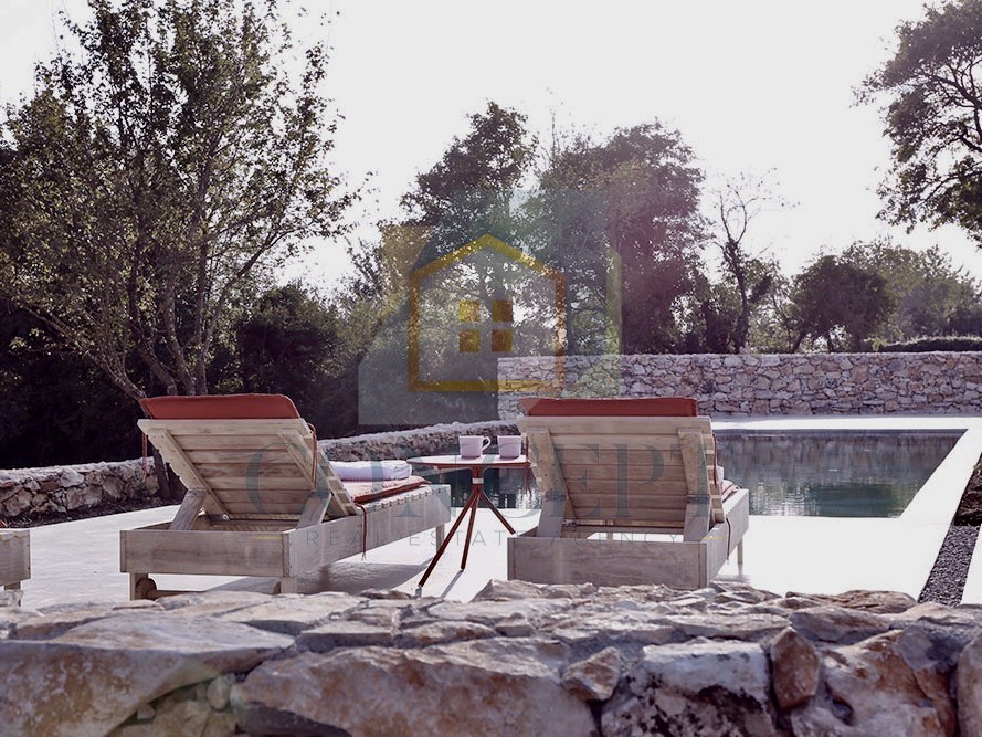 Venkovní prostor zahrnuje velký bazén s chatkou (šatny, sprcha a toaleta), kterou lze přeměnit na saunu nebo wellness zónu, pergolu se zastíněným prostorem a grilem, a upravenou zahradu se středozemními bylinami, levandulí, rozmarýnem, jasmínem, cypřiši, ořechovými stromy a mišpulemi. Jsou zajištěna krytá parkovací místa pro dvě vozidla a další prostor pro 8–10 automobilů.