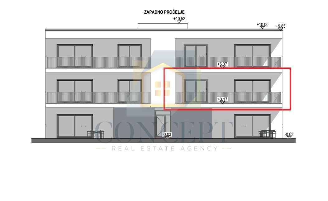 Na prodej je byt v prvním patře moderní budovy na vynikající lokalitě, v oblasti se všemi potřebnými službami, vzdálené pouhých 7 km od Poreče a moře. Byt bude mít vnitřní plochu 70,3 m², z terasy o dodatečné ploše 23,8 m² se bude nabízet nádherný výhled na moře.