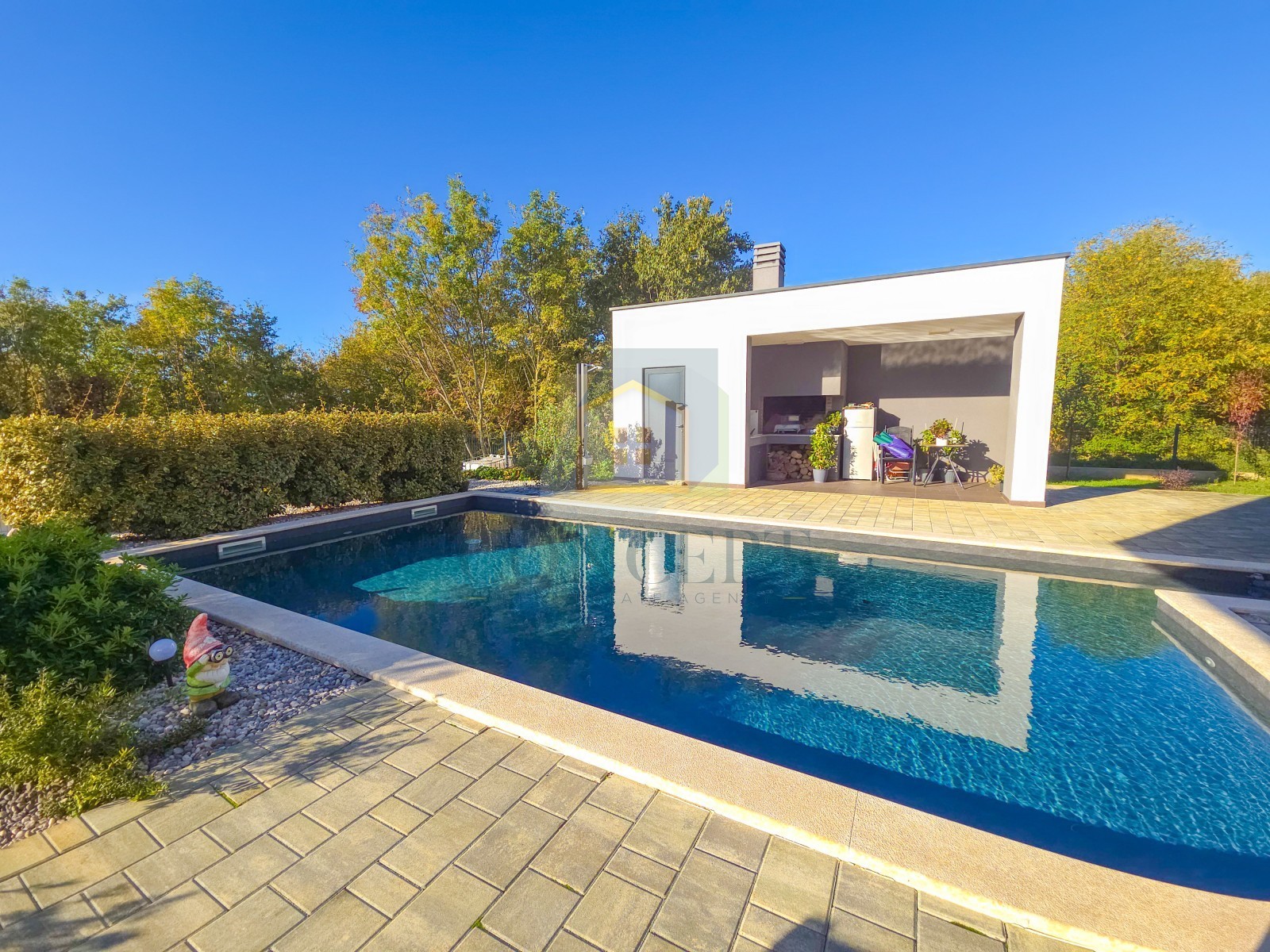 Na zahradě je instalován bazén o rozloze 36 m² se veškerým potřebným vybavením, venkovní kuchyň s připojením na vodu, elektřinu a krb, a dlažební pláž kolem bazénu. Na zbytku pozemku je plánována ošetřovaná tráva s automatickým zavlažováním. Je zajištěno parkovací místo pro dvě auta.