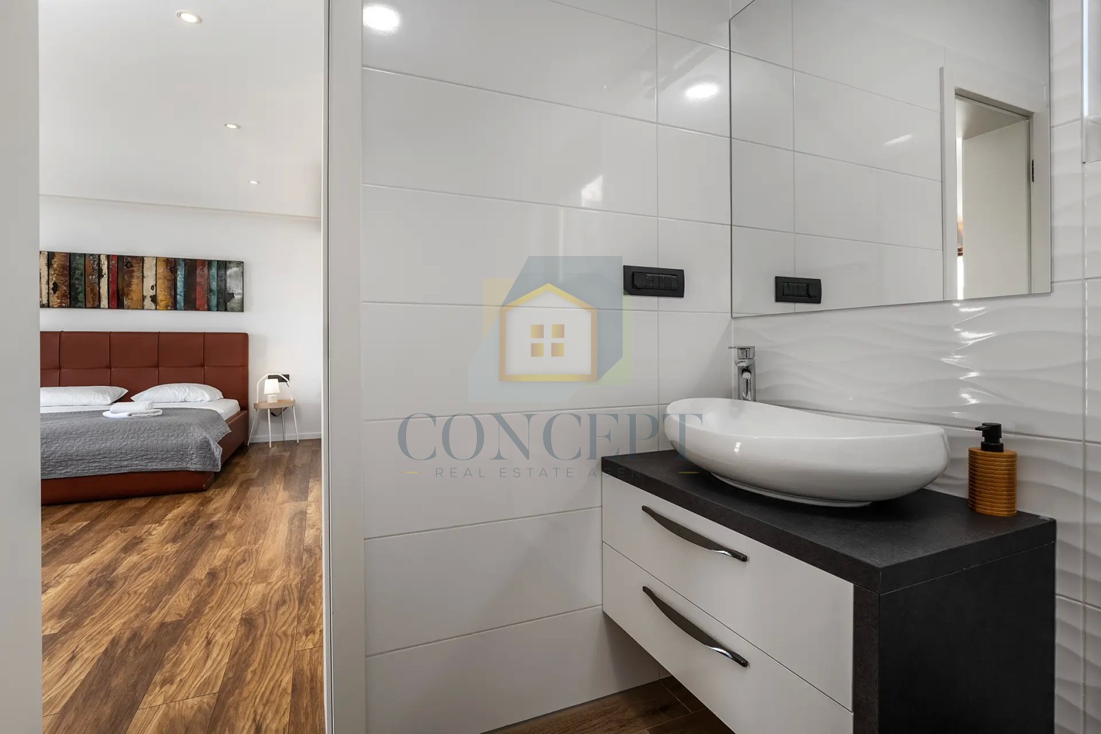 Das Schlafzimmer im Erdgeschoss verfügt über ein eigenes Badezimmer und einen separaten Eingang, was maximale Privatsphäre bietet und sich ideal als Gästezimmer oder zusätzliche Wohneinheit eignet.
