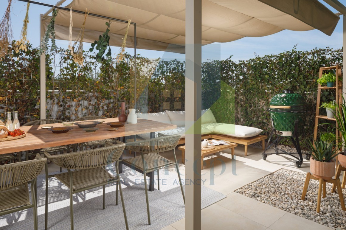 Im eingezäunten Innenhof befindet sich eine Relaxzone mit Grill und einem Essbereich im Freien, ideal zum Entspannen während der warmen Monate.