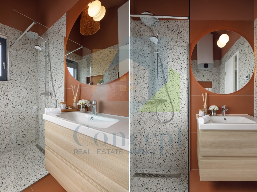 Nur 900 m vom Meer entfernt in Poreč befindet sich das letzte Reihenhaus, das einen komfortablen und modernen Lebensstil bietet. Das Haus erstreckt sich über drei Etagen mit einer Gesamtwohnfläche von 83 m². Der 137 m² große Garten ist eingezäunt und bietet Privatsphäre sowie einen wunderschönen Blick auf das Meer.
