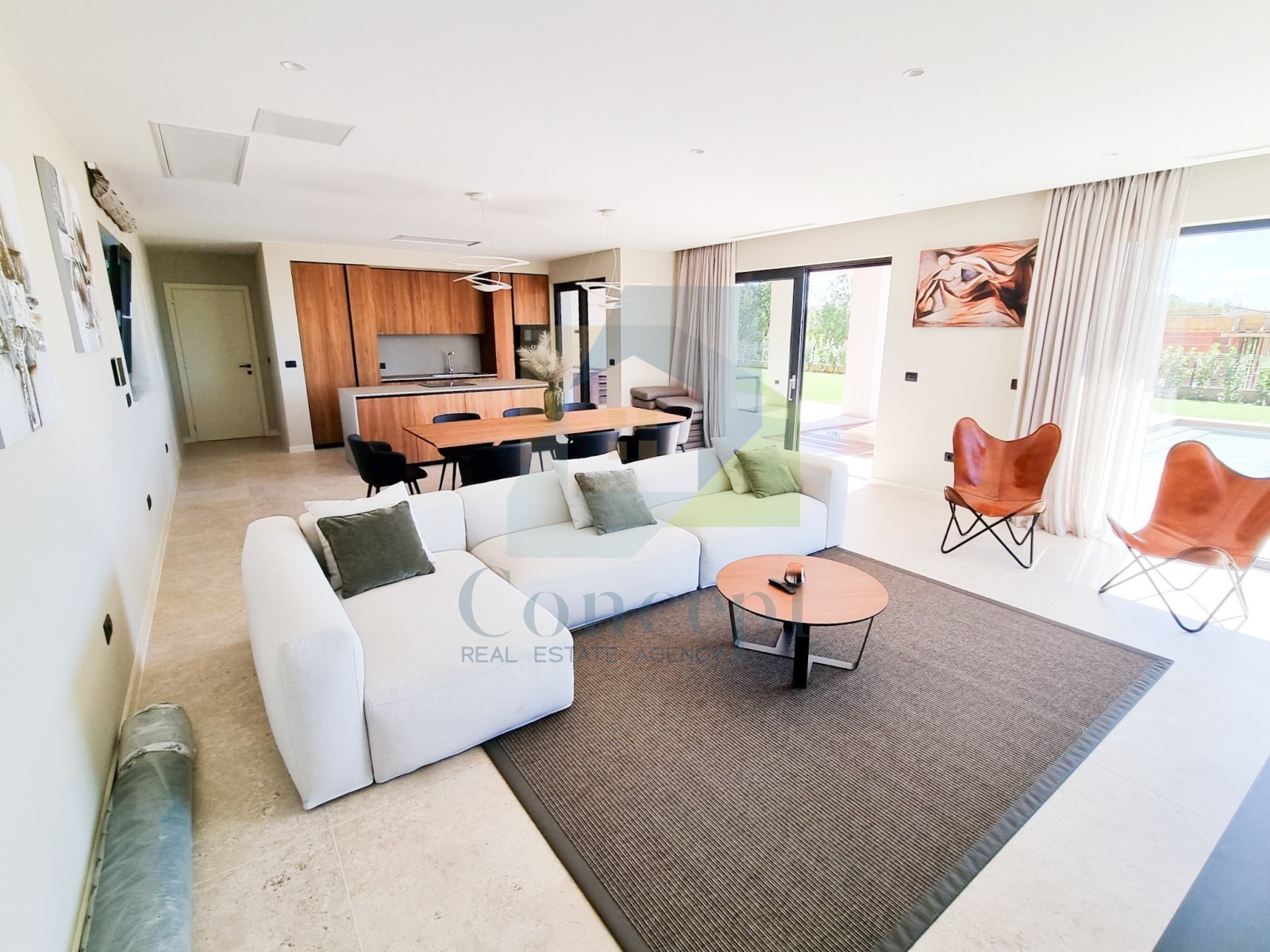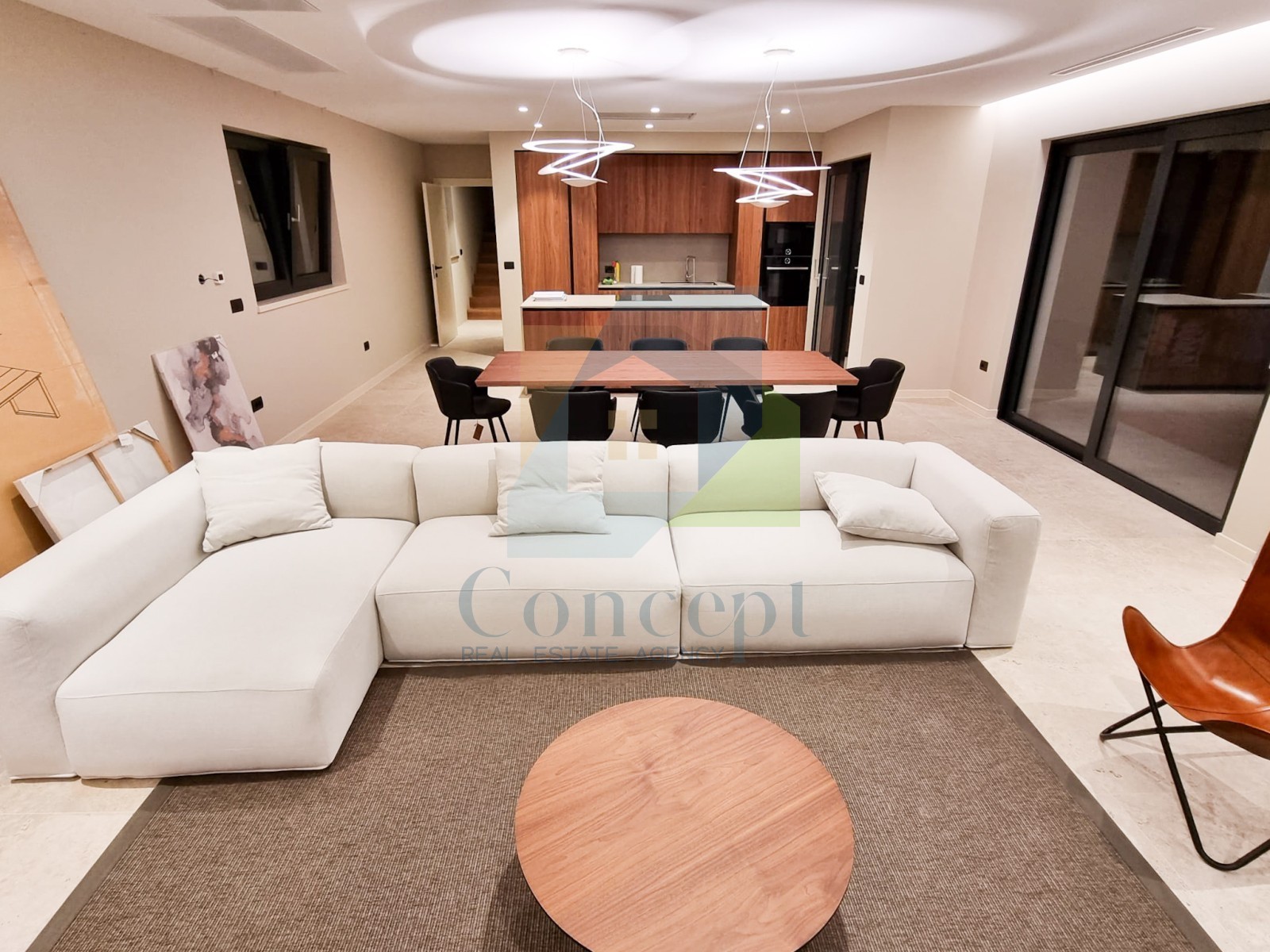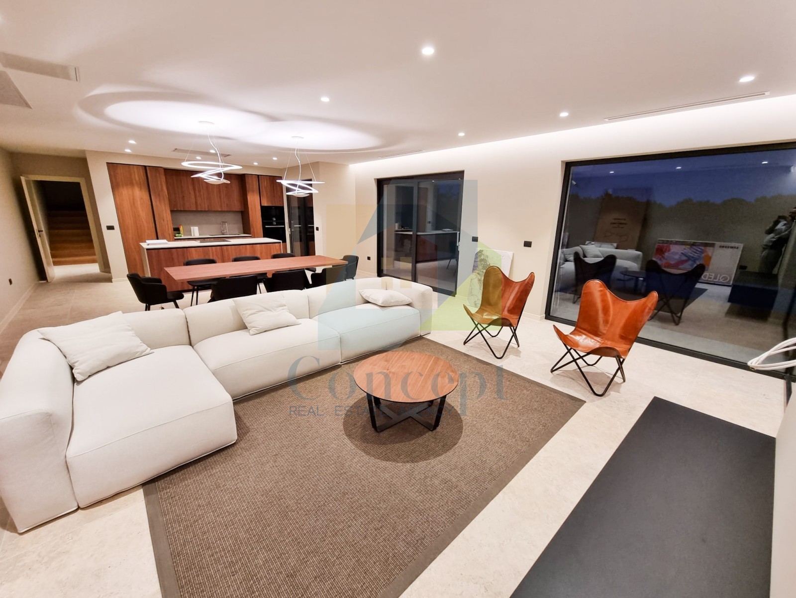 Im Erdgeschoss der Villa befindet sich ein eleganter Eingangsbereich, der in ein geräumiges Wohnzimmer führt, das über große Glaswände mit dem Außenbereich verbunden ist. Dieser offene Raum umfasst eine modern ausgestattete Küche, ein Esszimmer und ein Wohnzimmer. Auf derselben Etage gibt es auch eine Toilette/Wäschekammer sowie eine innere Treppe.