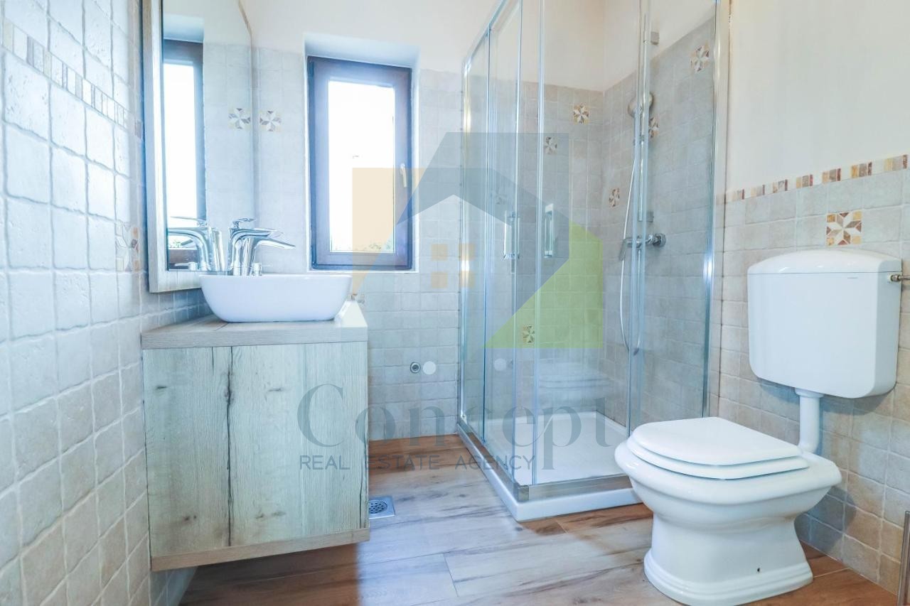 Das Erdgeschoss besteht aus einem Vorraum, einem Eingangsflur, einem Badezimmer, einer Toilette, einem Abstellraum, einem Schlafzimmer und einem geräumigen Wohnzimmer mit Essbereich und moderner Küche im Open-Space-Konzept. Vom Wohnzimmer aus gelangt man auf die überdachte Terrasse und die Sonnenterrasse mit Pool, die einen idealen Raum zum Entspannen schafft.