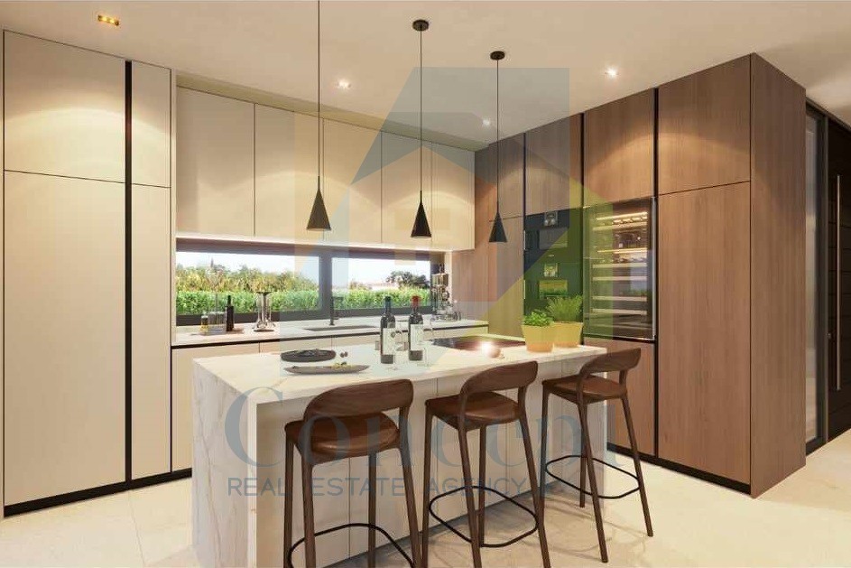 Im Erdgeschoss gibt es einen Eingangsbereich, einen Flur, ein Gäste-WC, einen Waschraum und einen Technikraum. Das geräumige Wohnzimmer ist mit einer modernen Küche und einem Essbereich verbunden und hat einen Zugang zur Sonnenterrasse mit Überlaufpool und Jacuzzi. Auf derselben Etage befindet sich auch ein Schlafzimmer mit eigenem Badezimmer und direktem Zugang zur Terrasse.