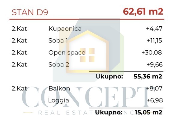 Apartment D9 – located on the second floor, with a total area of 62.61 m². It consists of an entrance hallway, a bathroom, two bedrooms (one of which has access to a balcony), and a living room with an open-concept kitchen and dining area leading to a loggia.