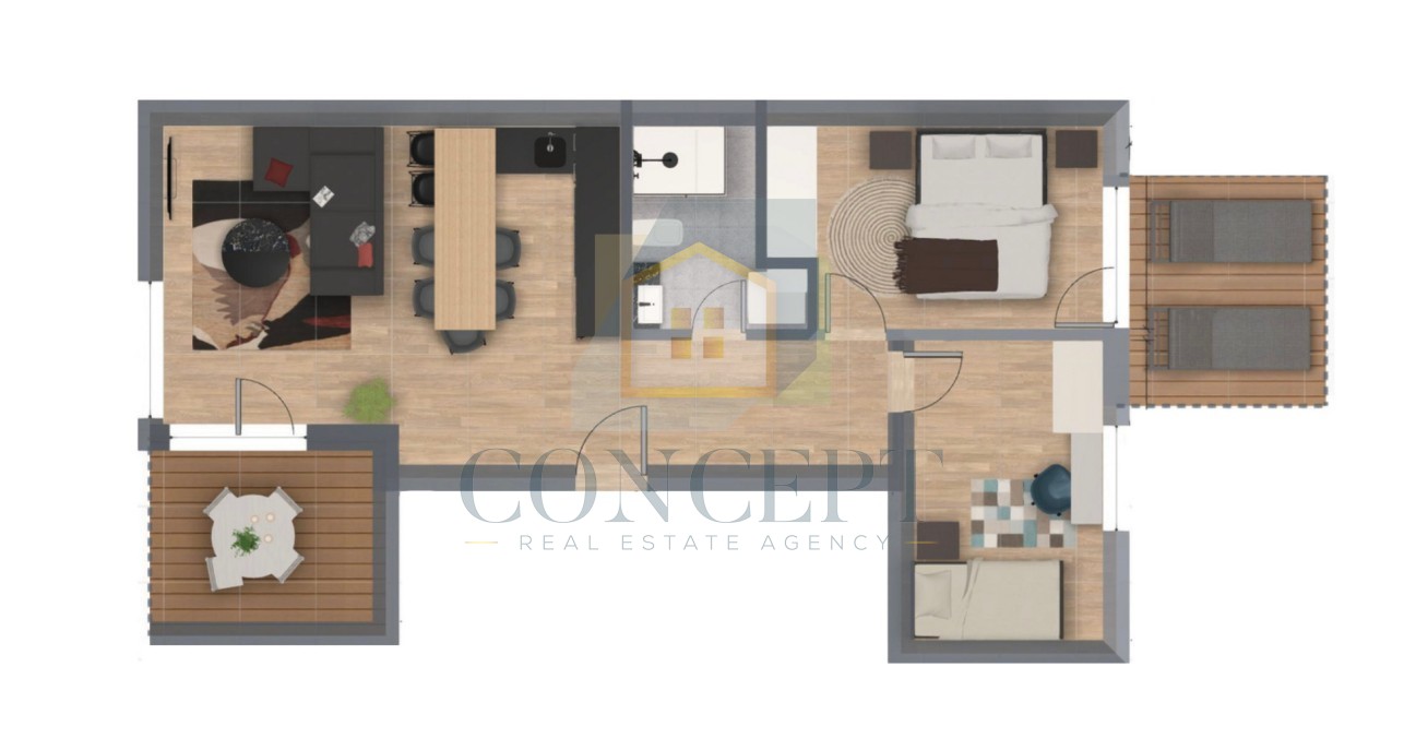 Apartment D10 – located on the second floor, with a total area of 68.72 m², and also has a rooftop terrace of 53.93 m² (included in the total area by coefficient), offering a beautiful view of the sea. The apartment consists of an entrance hallway, a bathroom, two bedrooms (one of which has access to a balcony), and a living room with an open-concept kitchen and dining area leading to a loggia.