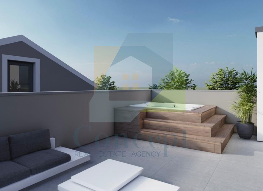 Potkrovlje je osmišljeno kao poseban prostor s dodatnom spavaćom sobom koja uključuje vlastitu kupaonicu i garderobu. Iz sobe se izlazi na prostranu nenatkrivenu terasu od 21,04 m², idealnu za uživanje na otvorenom.