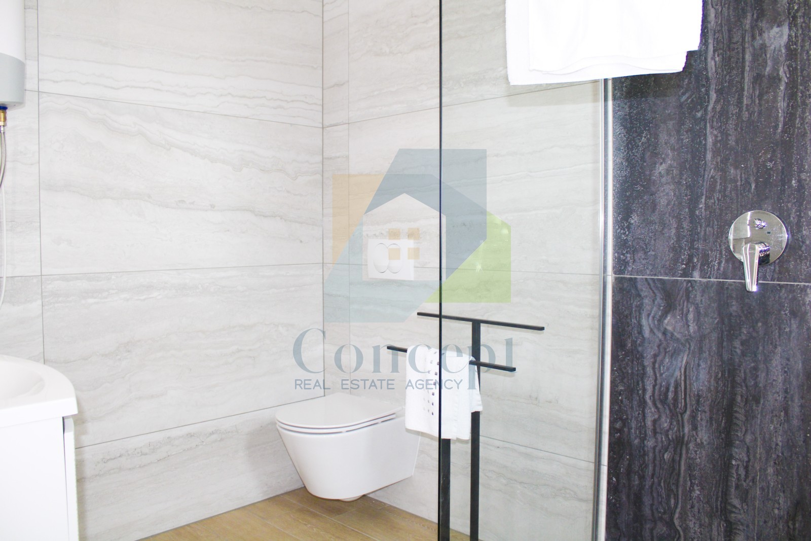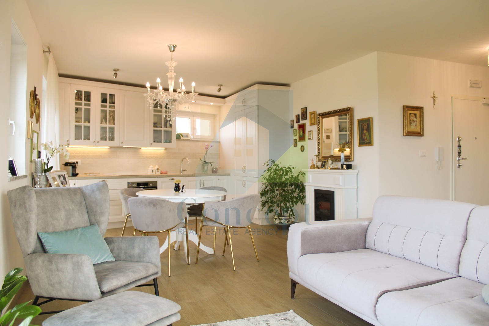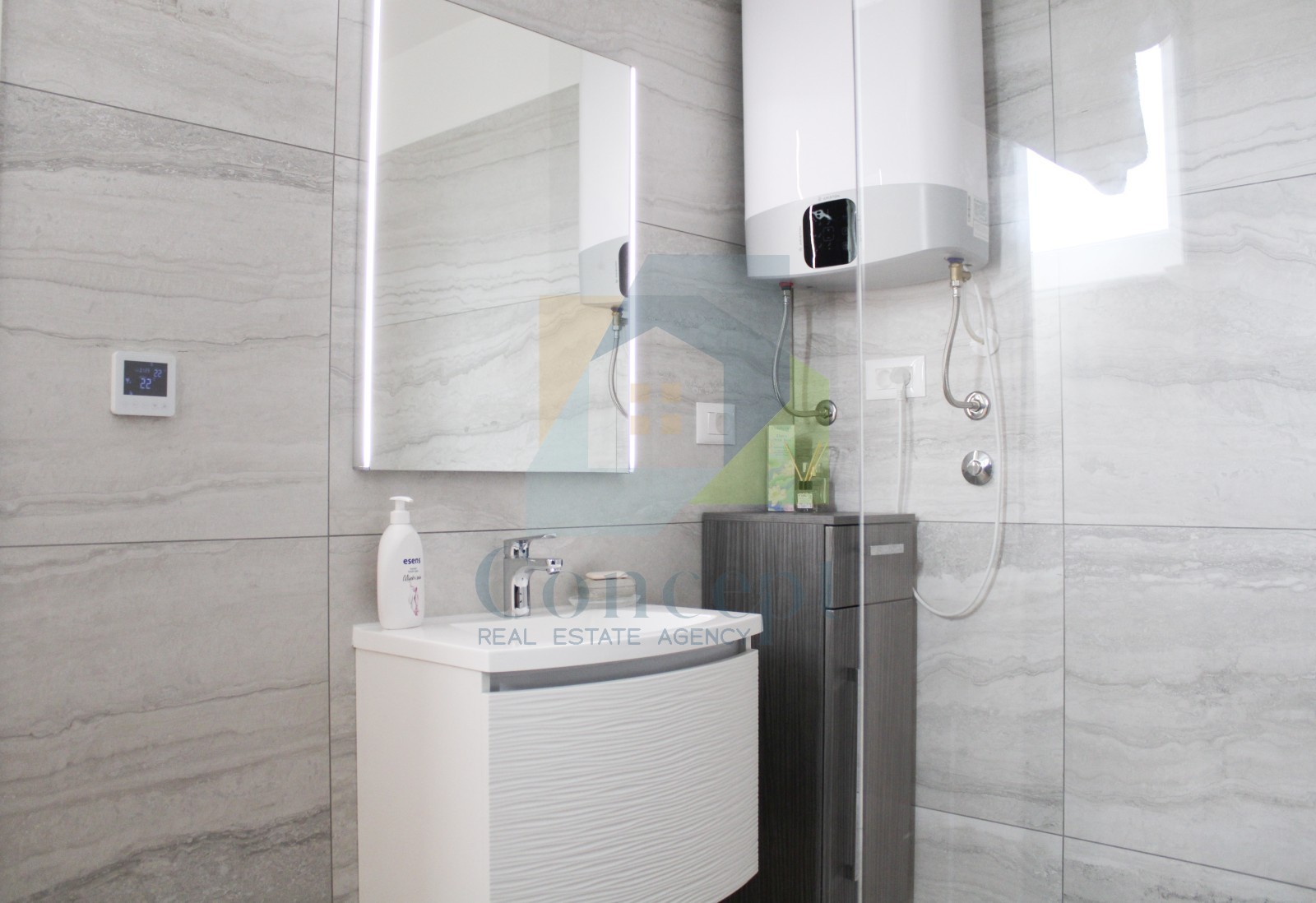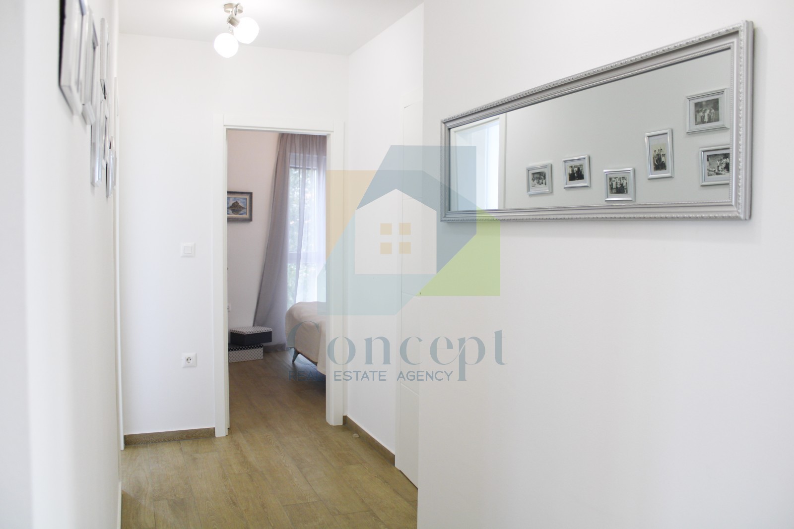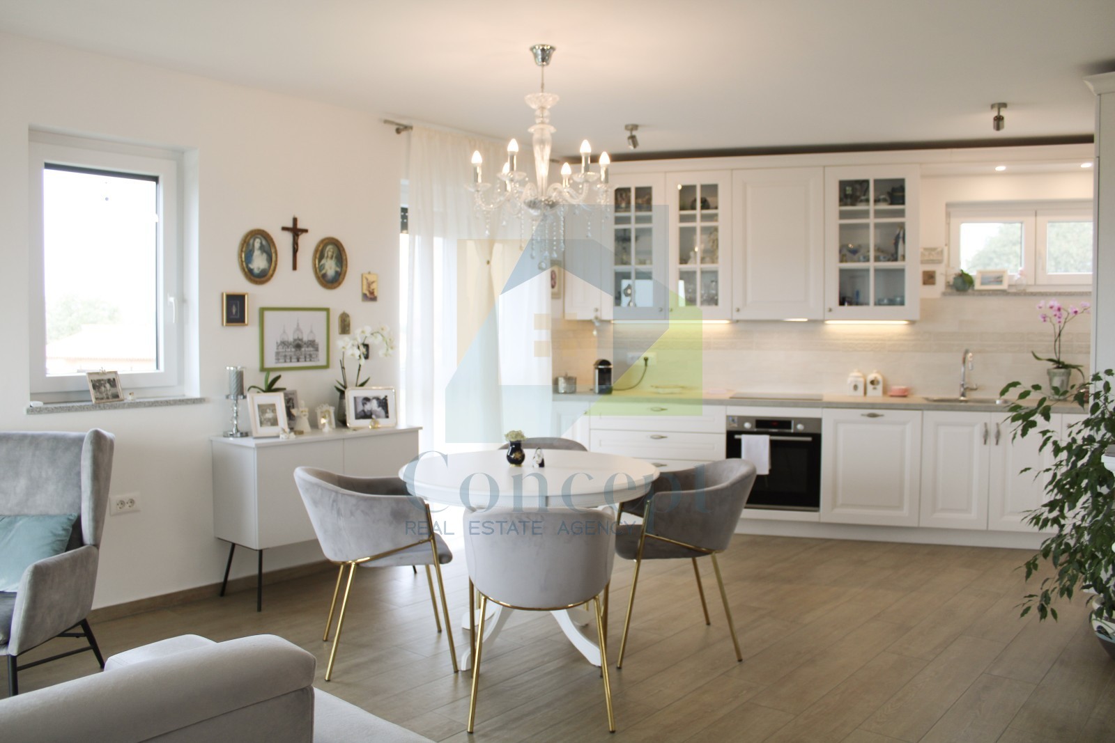 Opremljen je suvremenim sadržajima, uključujući podno grijanje i klima uređaje u svim prostorijama, što osigurava udobnost tijekom cijele godine. Komarnici na prozorima pružaju dodatnu zaštitu od insekata, dok visoko kvalitetna PVC stolarija jamči izvrsnu zvučnu izolaciju. Protuprovalna vrata dodatno osiguravaju sigurnost. Osim spomenutoga, u svakoj sobi se nalazi i TV priključak kao i SAT antena. Kuhinja je pažljivo dizajnirana i izrađena od visokokvalitetnog drvenog materijala, čineći je savršenim mjestom za kulinarske užitke.