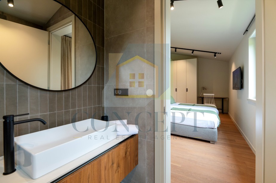 Na katu se nalaze tri spavaće sobe, svaka s vlastitom kupaonicom, a dvije imaju izlaz na zajedničku terasu površine 68 m², s pogledom na okolno zelenilo.