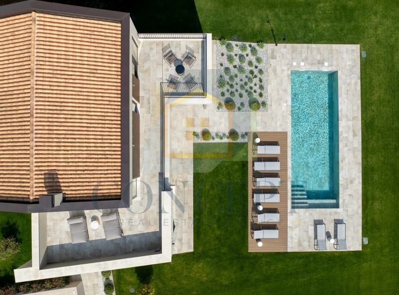 Iz dnevnog boravka izlazi se na natkrivenu terasu površine 30 m² s opremljenom ljetnom kuhinjom. Terasa vodi prema sunčalištu popločanom tikovinom, uz bazen veličine 10 x 4 m s dizalicom topline. Okućnica je uređena kvalitetnim talijanskim pločicama i travnjakom, s dovoljno prostora za boravak na otvorenom.