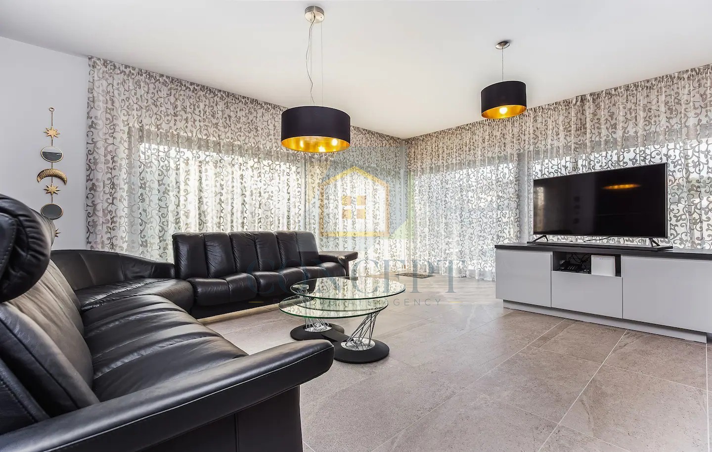 Na staklenim stijenama i prozorima nalaze se električne rolete i komarnici. Prozori su izrađeni od PVC stolarije, dok su staklene stijene u dnevnom boravku aluminijske.