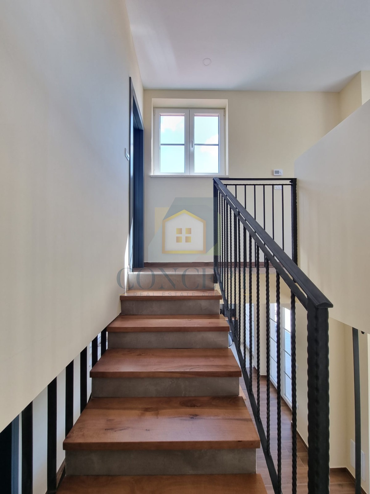 Unutarnje stubište s drvenim gazištima od hrasta vodi na kat, gdje se nalazi dodatna spavaća soba s terasom, pogledom na more i okolicu te vlastitom prostranom kupaonicom.