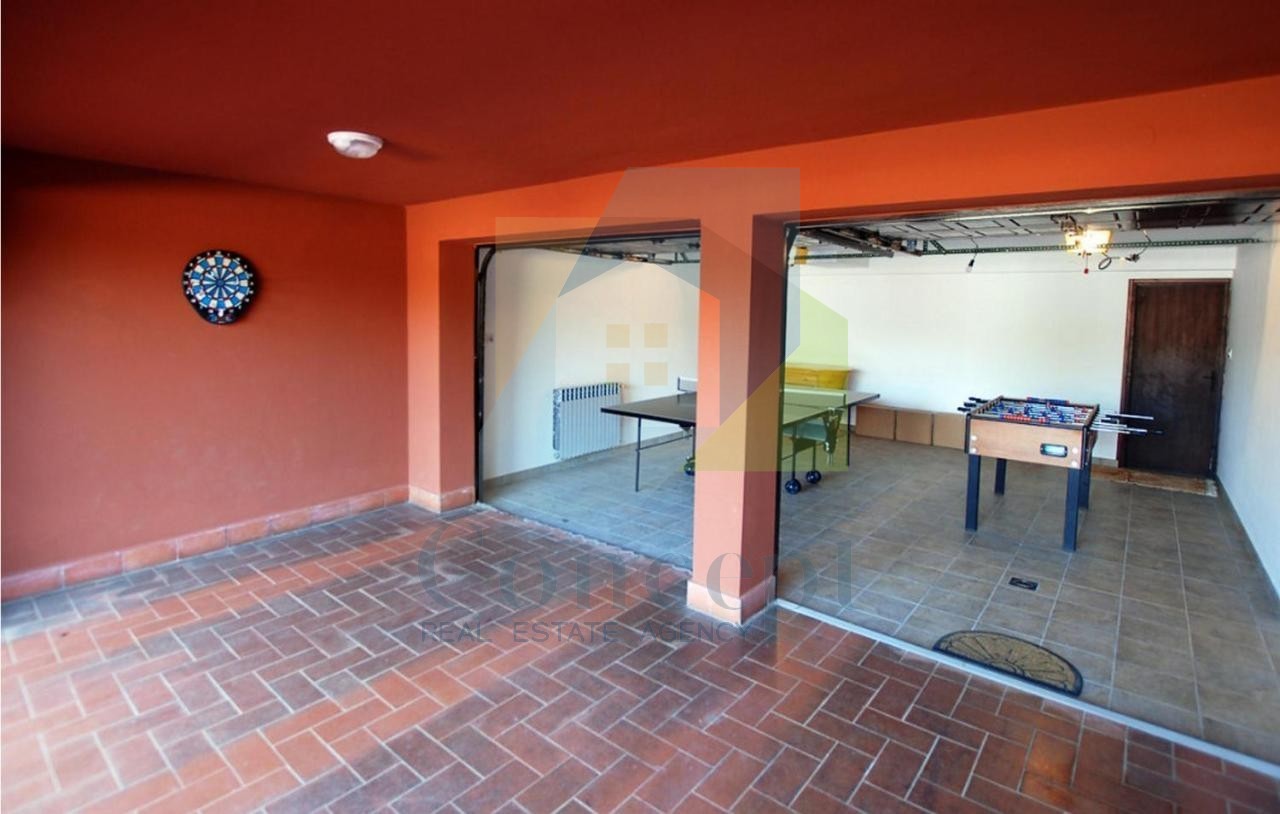 La casa si sviluppa su tre piani. Nel seminterrato si trovano un garage per due veicoli, una centrale termica, una lavanderia e un ulteriore ripostiglio. Il piano terra comprende un ampio soggiorno collegato a una cucina e una sala da pranzo, con accesso a una terrazza coperta con piscina. Nello stesso piano ci sono tre camere da letto, due bagni e un WC per gli ospiti. La mansarda è adattata a esigenze aggiuntive e attualmente funge da camera da letto, ma può avere anche un altro utilizzo.