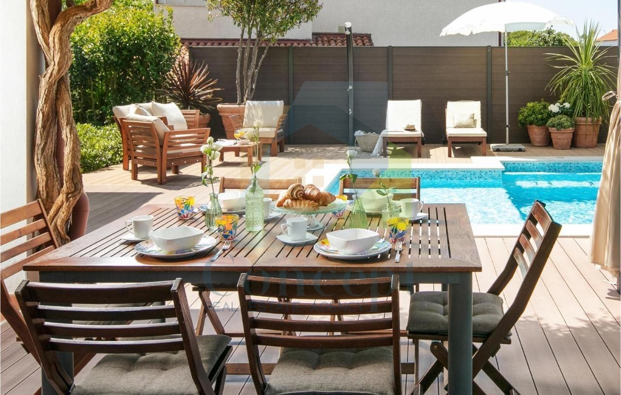 Il giardino è adornato da erbe mediterranee, un prato e una grande piscina con terrazza solarium. Il sistema di irrigazione automatica facilita la manutenzione del giardino, mentre il cortile recintato garantisce privacy. Davanti all'ingresso c'è un parcheggio pubblico per più veicoli.