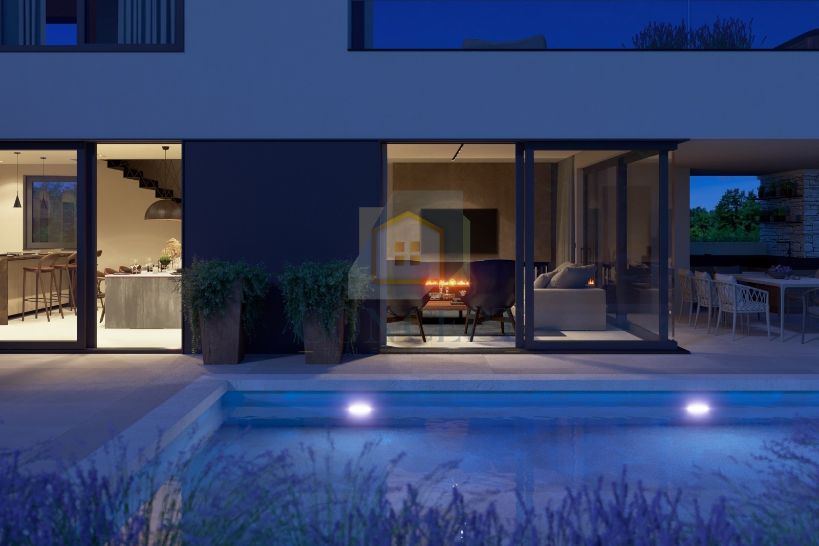 Nel giardino è previsto un piscina di 40 m², accanto alla quale sarà collocato uno spazio appositamente arredato per socializzare e rilassarsi attorno al fuoco, il cosiddetto "fire pit".