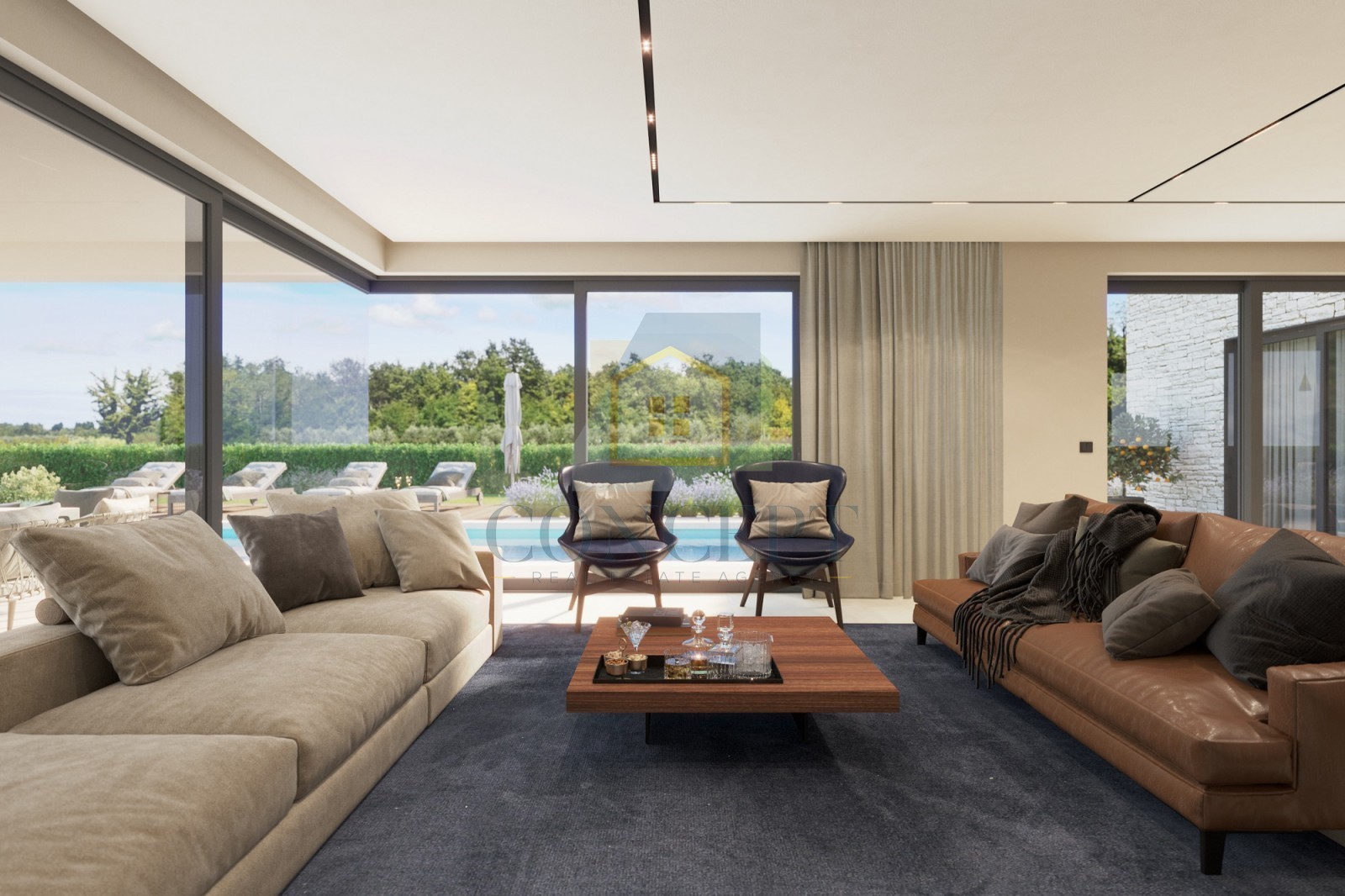 La villa sarà venduta con la formula "chiavi in mano" (senza mobili). I mobili mostrati nelle visualizzazioni possono essere offerti con un supplemento.